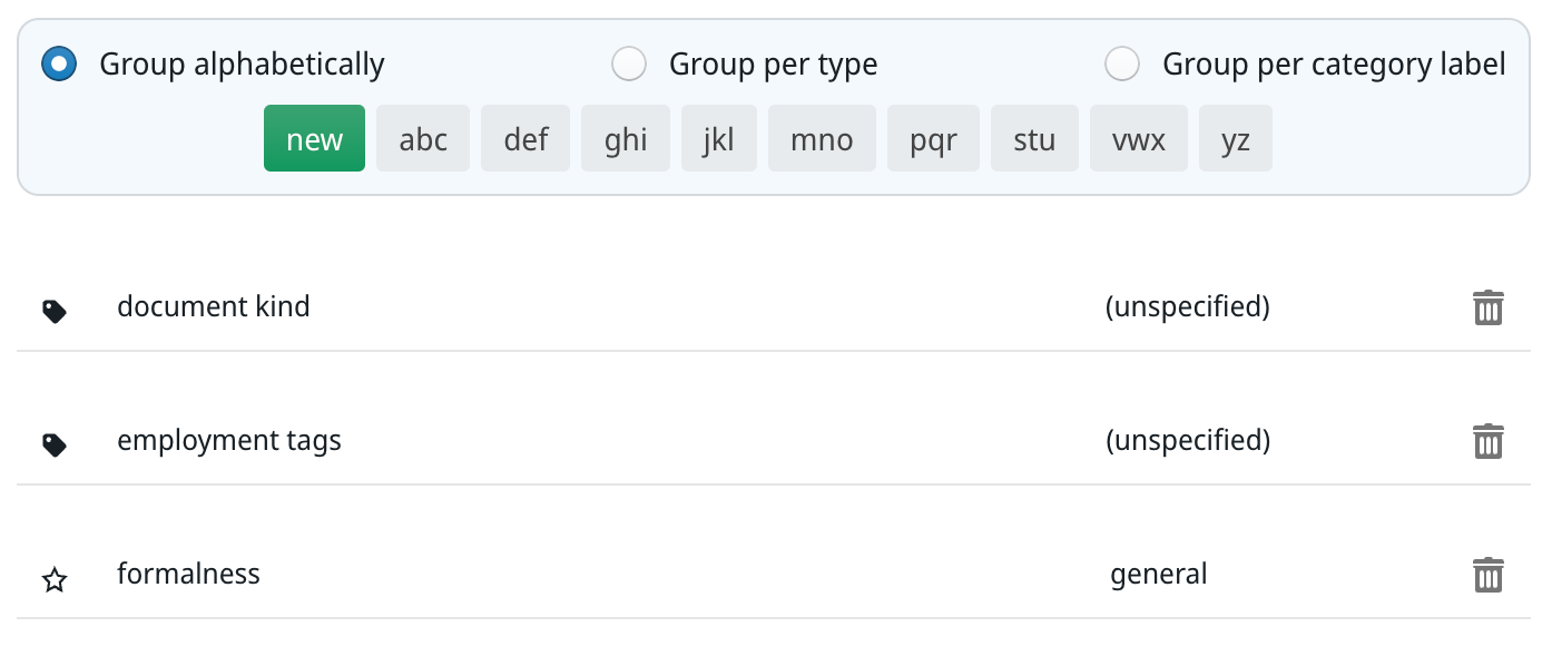 By default, attributes are grouped alphabetically on this page. By selecting the relevant option, you can group them per type or per category label.