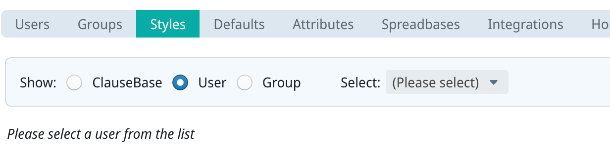 By default the “user” button will be selected, which means that – by filtering for a certain user in the “select:” section, you can access or define the standard styles for use by that user. If you select the “group” button, you can do the same for any groups in your organisation. Finally, clicking your organisation’s name will enable you to access or define the standard styles for use throughout your organisation.