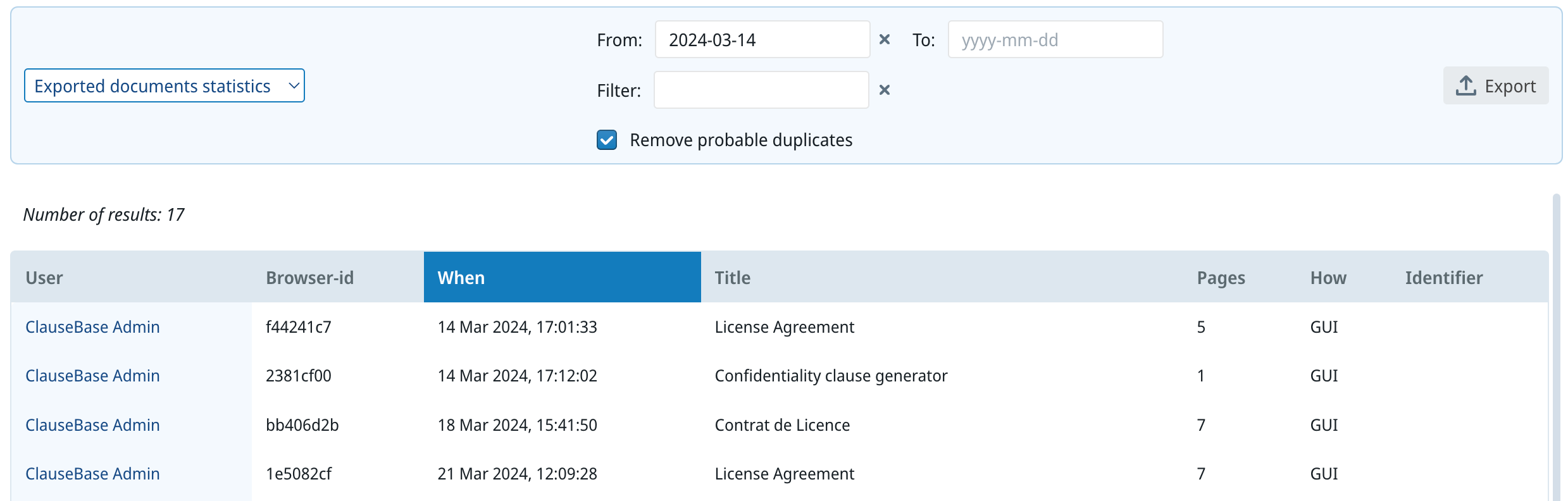 This can be particularly interesting when using [anonymous links](https://help.clause9.com/qna/how-to-qna/send-a-questionnaire-to-someone-without-a-clausebase-account), for which the same (anonymous) account is used for everyone logging in. Using this browser-id and the date & time of the export, you can determine with reasonable certainty that a certain document was exported multiple times by the same user (e.g., if a user performs an export, then finds a typo and re-exports the same file a minute later).