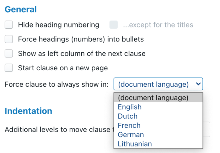 Even when a clause would have multiple language versions, you can force a certain instance of the clause to always show up in another language. (This can also be useful when certain content is only available in one specific language — instead of hiding that content in the other languages, or having errors show up, you can select this option to always print that one specific language.)