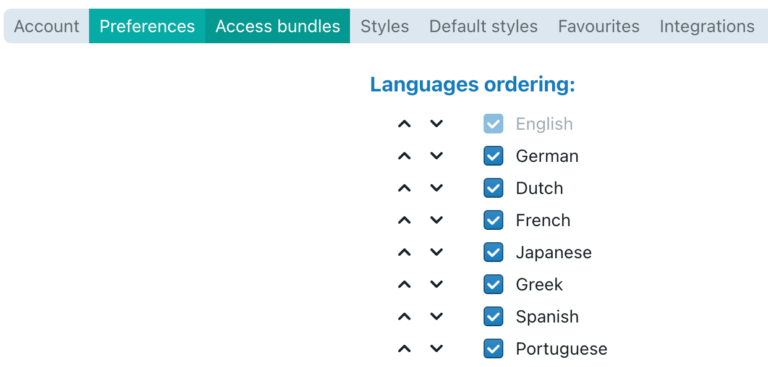 In the user’s account preferences, you can enable/disable and reorder the languages made available to the user. The list of languages selected here will be used as the basis to determine which languages to show/hide in Assemble Document, Q\&A and at the clause level.