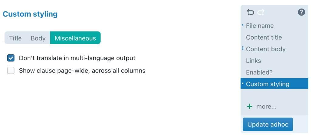 To enable this behaviour for every instance of a clause, you can activate *Don’t translate in multi-language output* under the custom styling of a clause.