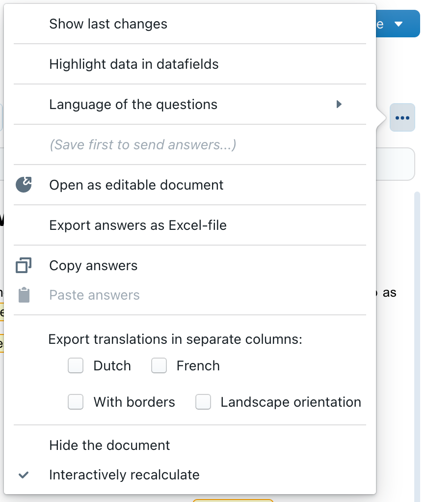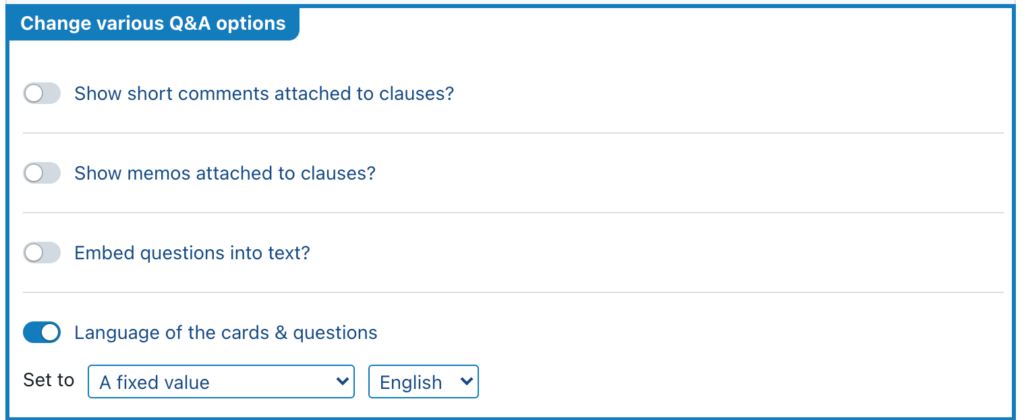 Within a Q\&A, the end-user can instead go <img src="https://1353649376-files.gitbook.io/~/files/v0/b/gitbook-x-prod.appspot.com/o/spaces%2FaTEDNbiFdDa6DW2eNG17%2Fuploads%2FnicfugFh4WpJ4WjsAoZo%2Fimage.png?alt=media&#x26;token=bd21c2cd-f9d8-4ac3-a06c-ed75c5d0c14a" alt="" data-size="line">button in the upper-right corner, and activate the same options from the popup-menu. Note that, unlike Assemble Document (for which the user interface is always in English), you can optionally translate the cards, questions and predefined options of a Q\&A, and allow the end-user to switch the relevant language on-the-fly.