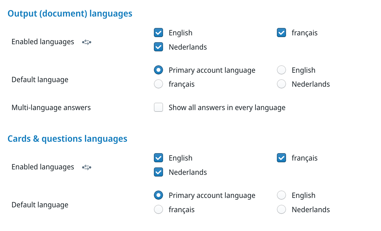 In the *options* panel of the Q\&A, you can specify which languages should be available to the end-user — both with respect to the user interface (cards & questions) and for the actual document contents.