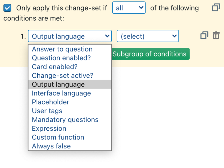 By subjecting the surrounding change-set to conditions, you can determine in which circumstances certain languages must be (de)activated. More detailed information can be found [elsewhere](https://help.clause9.com/qna/types-of-changes).