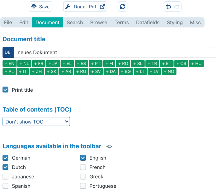 * Checking or unchecking **output** languages will avoid that users can output documents in this language. On a practical level, this means that the dropdown menu in the *Document language* question — which you can insert similar to how a text-based or number-based question is inserted into a Card— will only show the selected languages.