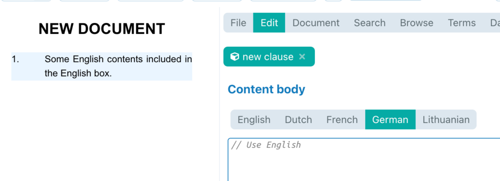 You could even mix-and-match the language content to reuse. For example, on the server above (which supports English, Dutch, German and Lithuanian), you could provide English content, insert `// Use English` in Dutch and French (so that Dutch and French language versions of the document will show the English contents of this clause), but also provide a German version and insert `// Use German` in the Lithuanian version.