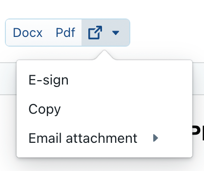 If you want to “promote” the use of e-signatures for certain documents, you can also insert a global placeholder System-defined > Export buttons > Promote E-sign Export Button and set its value to true. The result will be that the e-signing button then gets “promoted” to the top bar, instead of being part of the dropdown menu.