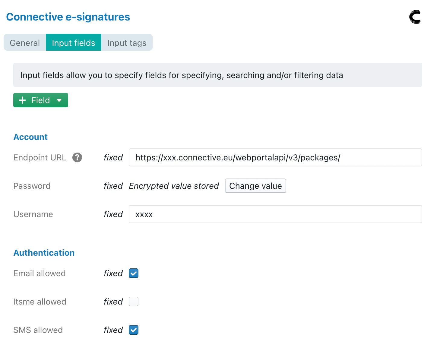 In the Input fields sheet you need to your account name (a URL in the case of Connective), password and username — these should have been provided to your by your e-signature provider.