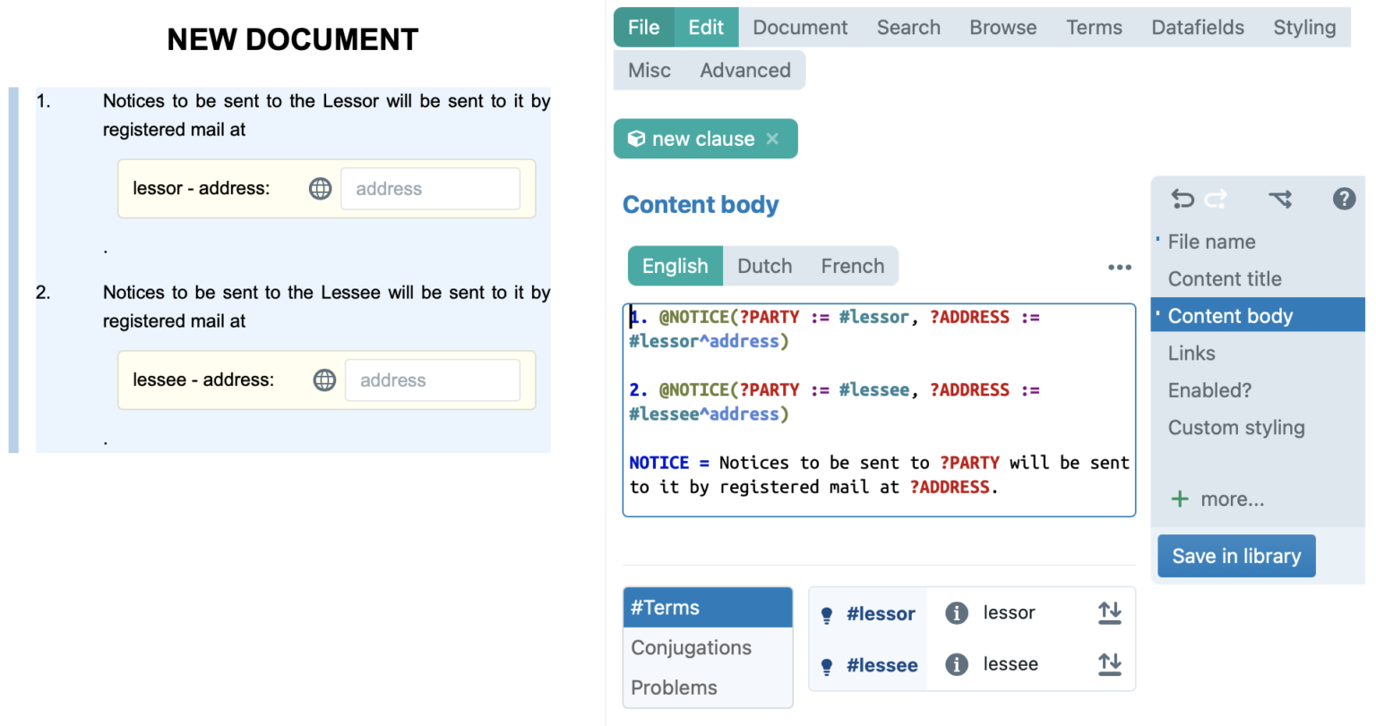 Whereas snippets already enable you to replace a piece of text that is used multiple times across a clause or across several clauses/documents, combining snippets with parameters further upgrades the re-usability of a snippet by enabling you to replace the placeholder(s) in a snippet with different input each time you use the snippet.