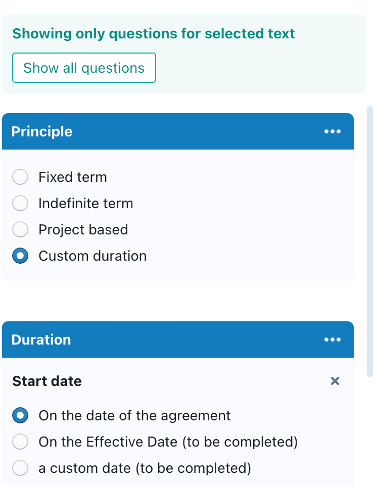 Conversely, when you select this option, Clause9 will hide questions that are not directly or indirectly impacting the selected text. Such impact can take multiple forms: