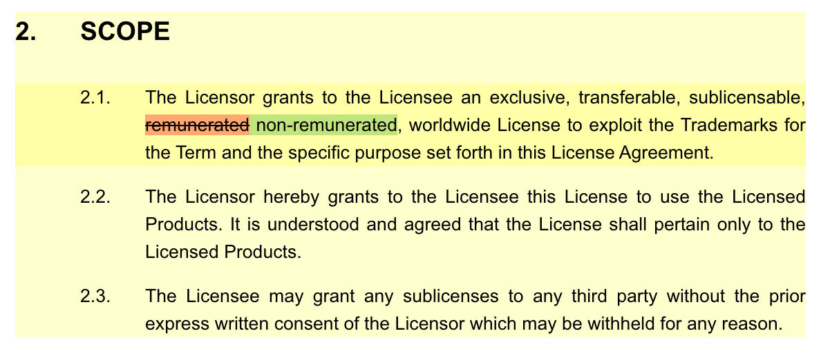 In the example below, the user switched from predefined answer “remunerated license” to “non-remunerated license”. On the screen, the selected clause will have a yellow background (indicating that the clause got changed), while the deleted words are in orange and the newly inserted words are in green.