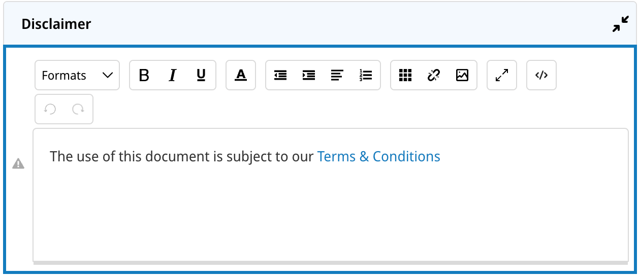 * As illustrated in the screenshots below, you can also include URLs in the disclaimer, by using the hyperlink button in the text editor.