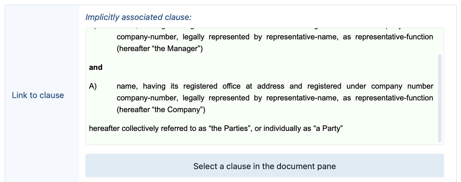 In many other scenarios, the connection between the question and the relevant clause is ambiguous or unknown. For such situations, you can use the *Link to clause* setting, to explicitly select a clause and link it to a certain question.