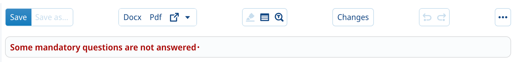 Note that, even when mandatory questions are unanswered, users can still save answers and/or export the document. If this is not desired, you can insert an [export options change](https://help.clause9.com/qna/types-of-changes) that disables certain types of export, and is subject to the condition *Mandatory questions — One or more unanswered.*