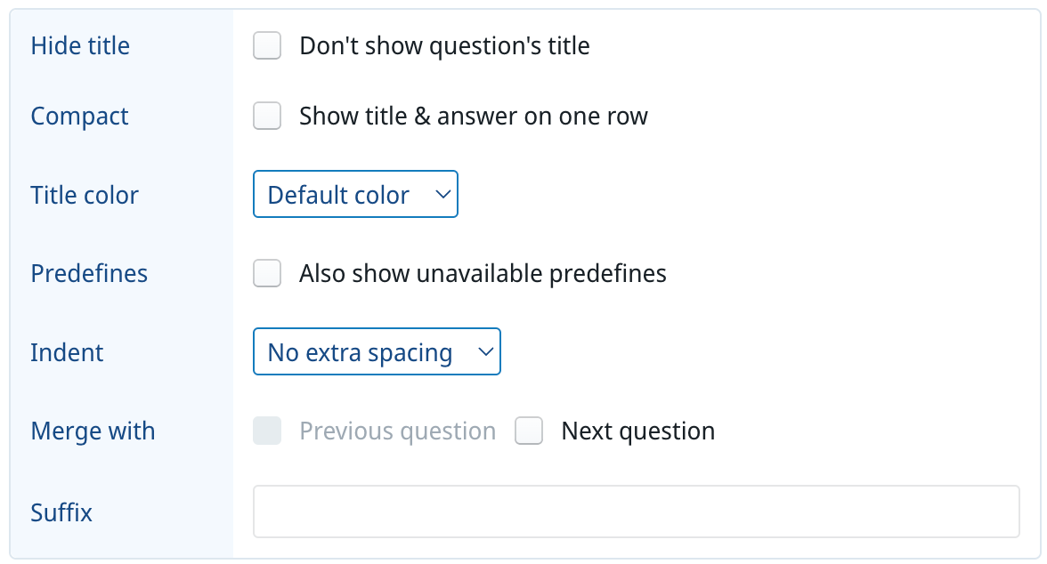 This setting allows you to show both the question and the title horizontally next to each other (if space is available). This can be particularly useful for typical forms for administrative information (name, address, email, etc.), where otherwise a lot of vertical space would be used.
