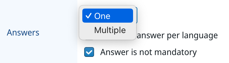 For each type of question, you can indicate that different answers should be possible per language. For example, while the name of a company will (usually) be the same across languages, the same will probably not hold true for the name of a city or the name of a product. In the latter situation, you will want to enable the *different answer per language* option, to allow the end-user to fill in different answers for each of the languages.